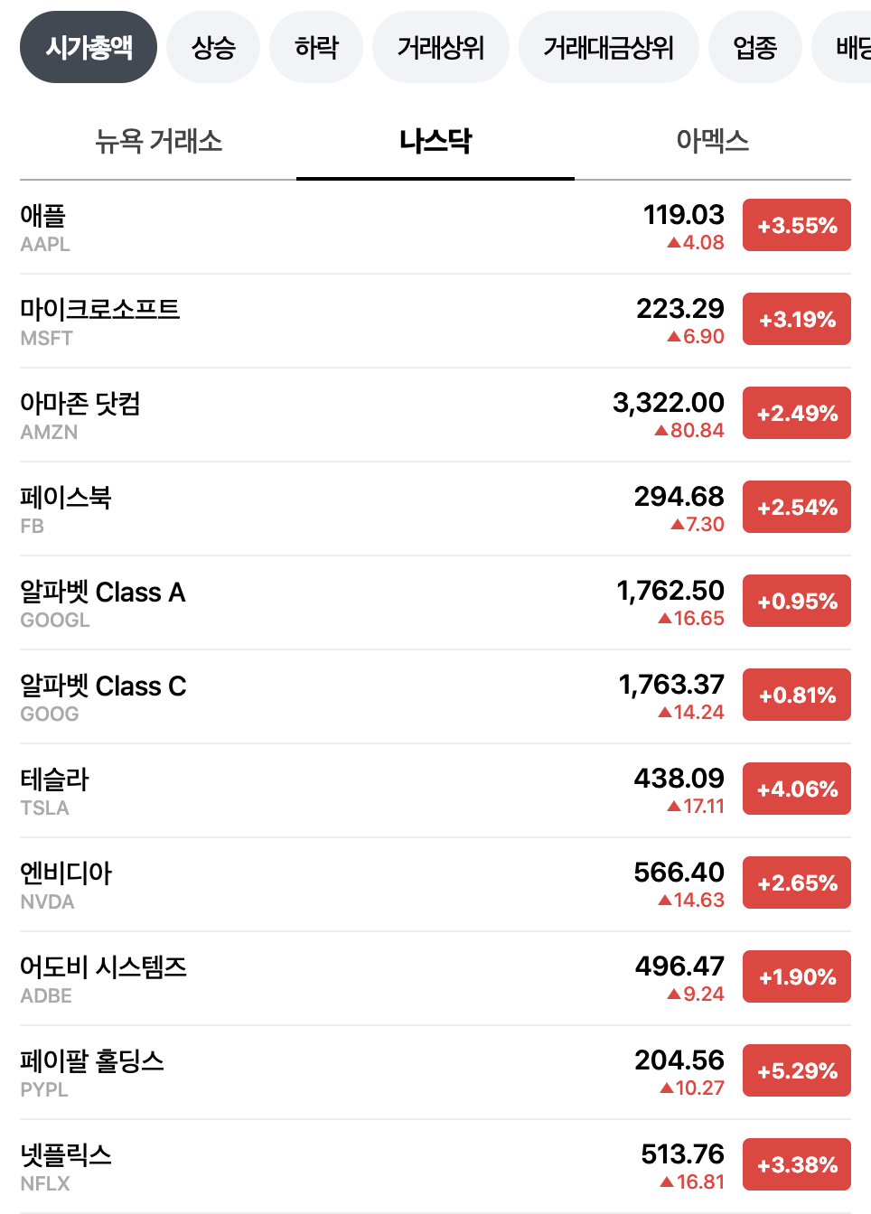 - 구글 주가 : 알파벳 A는 +0.95%를 기록하며 1,762.50 달러, 알파벳 C는 +0.81%를 기록하며 1,763.37 달러로 장마감.