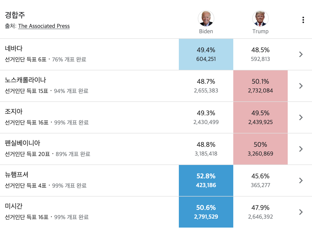 - 조지아, 펜실베니아에서 바이든이 빠르게 표차를 줄이고 있으며 네바다는 표차가 벌어지고 있습니다.