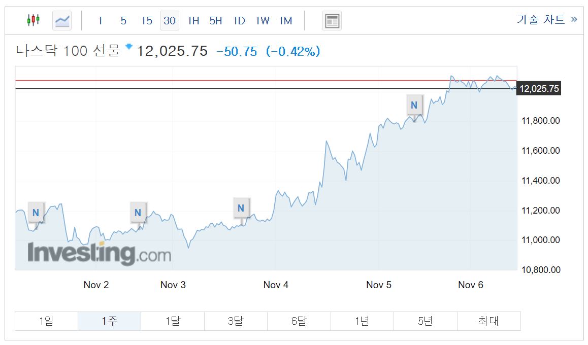 트럼프의 강경한 소송전에 나스닥 선물도 강한 상승을 멈추고 미세한 조정을 거쳐가고 있습니다.