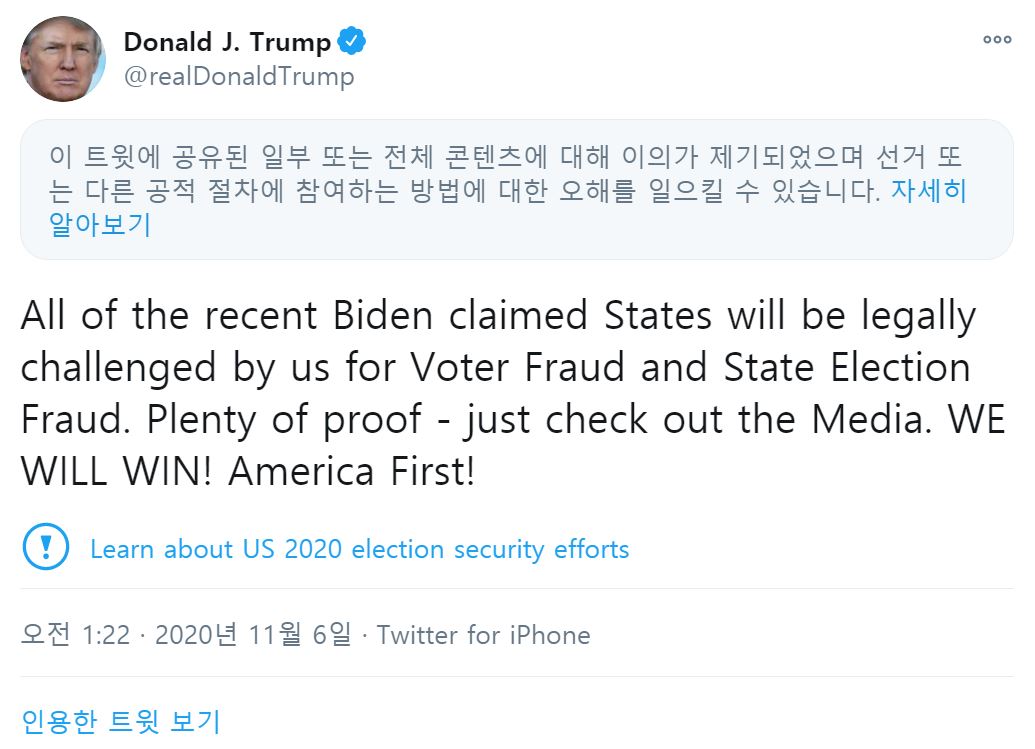 트럼프는 트위터에서 "바이든이 승리를 주장하는 모든 주들이 유권자 사기와 주의 선거 사기 때문에 우리에 의해 법적 도전을 받게 될 것"이라고 밝혔다.그는 "충분한 증거가 있다, 언론을 확인해봐라"고 밝혔습니다.