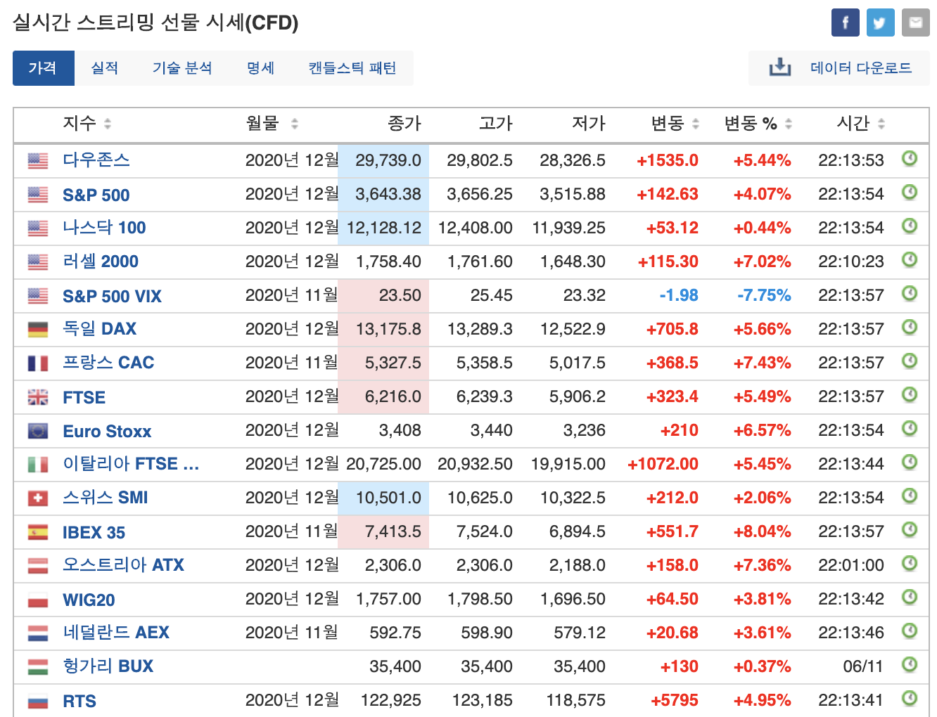 현재 유럽, 미국의 선물지수가 5~7%대 폭등을 보이고 있습니다. 나스닥만 빼고 모두가 폭등하고 있습니다.