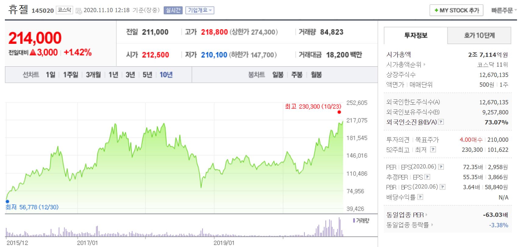 휴젤 주가는 코로나 19 이후 가파른 주가 상승을 보여주며 코스닥 시가총액 11위에 안착했습니다.