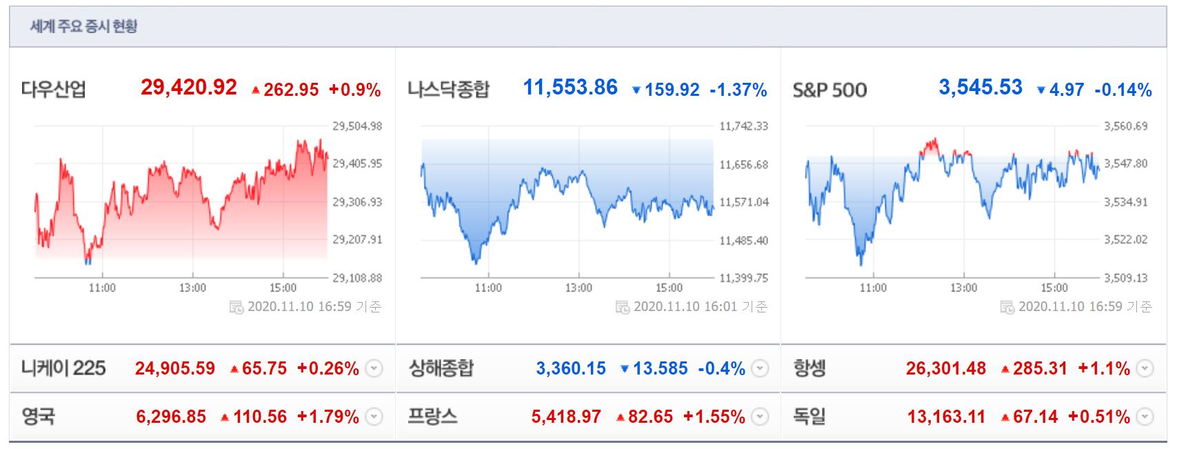 2020년 11월 10일(현지시간) 미증시 장마감 상황