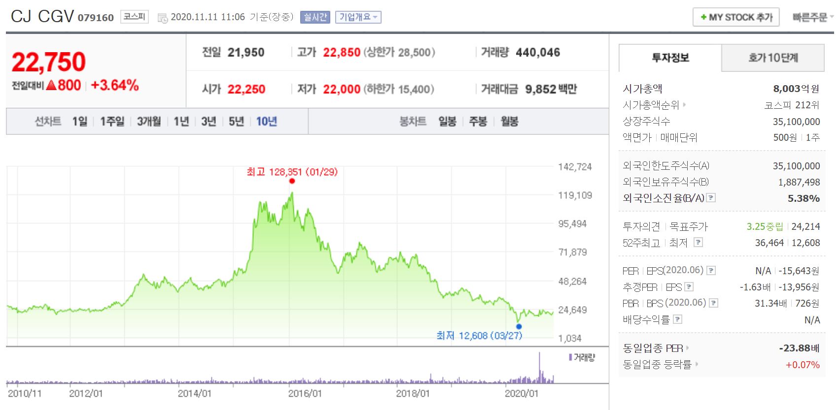 코로나 19 백신 효과도 주가에는 호재로 작용하고 있습니다. 하지만 한국을 포함한 상영관이 이는 국가가 백신을 얼마나 확보할 수 있을지, 또한 상용화되기까지 얼마나 시간이 걸릴지 알 수 없으며 이에 따라 단기간 내에 실적 회복을 이어갈 수는 없기에 투자 시 유의하시길 바랍니다.