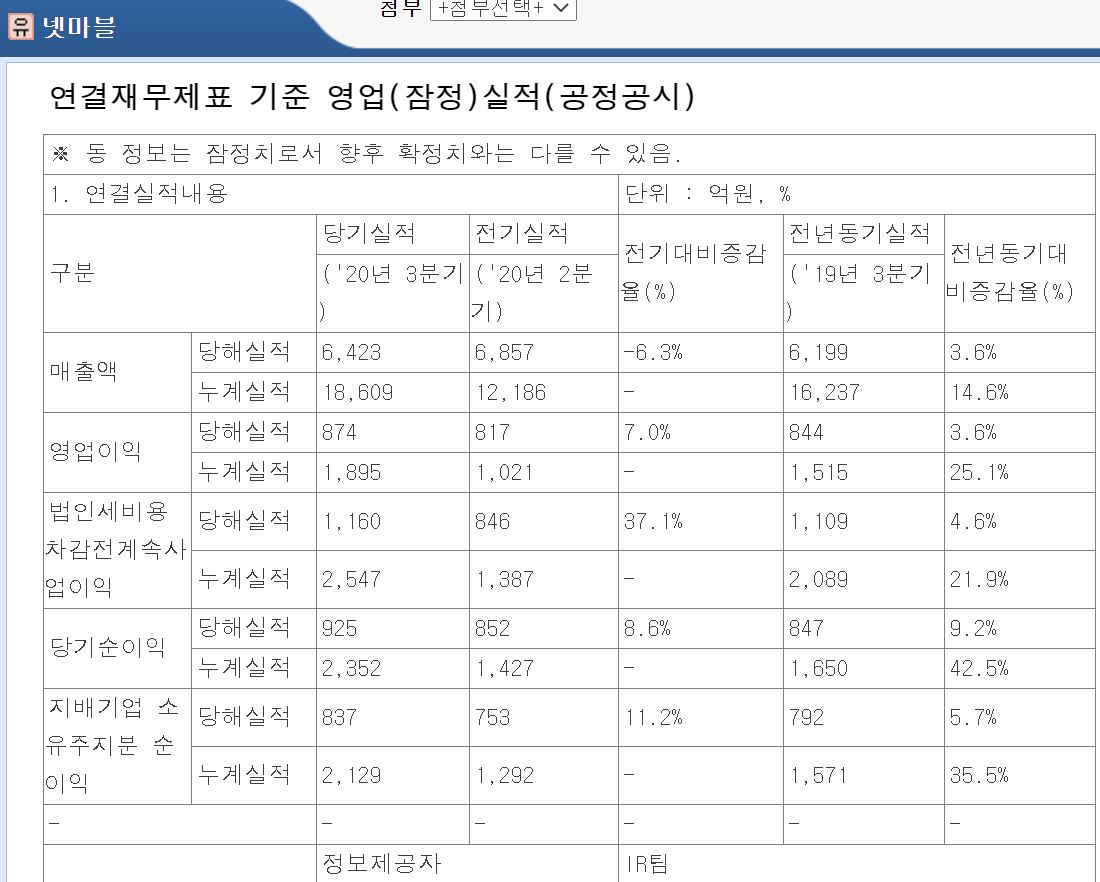 3분기 실적을 살펴보면 매출은 전분기 대비 6.3% 감소한 6,423억 원을 기록했으며, 전년 동기 대비는 3.6% 증가한 수치입니다.