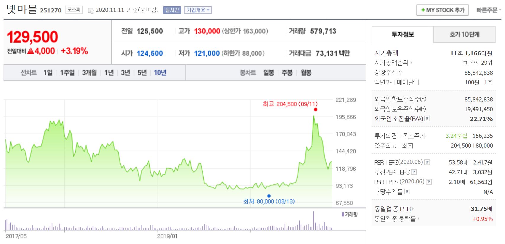 넷마블 주가는 2019년부터 바닥을 기다가 코로나 19 이후 살짝 반등을 준 후 지분을 가지고 있는 빅히트가 상장함에 따라 최고가 204,500원을 찍고 급락한 모습입니다.