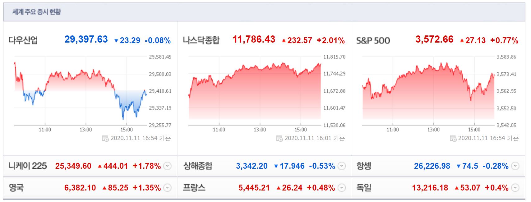 2020년 11월 12일(현지시간) 미증시 장마감 상황