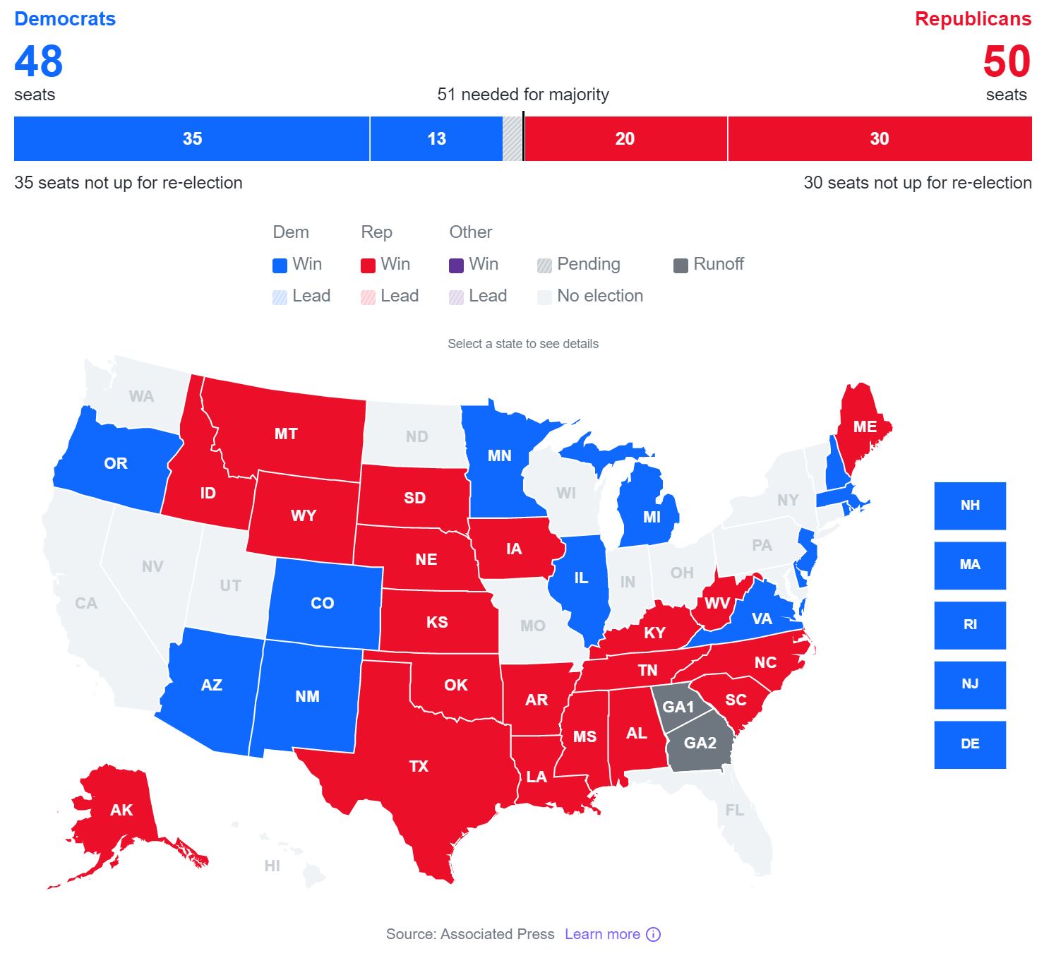 - 상원에서 공화당이 50석을 먼저 확보하였고 51석은 조지아 주에서 최종적으로 결정 날 것으로 예상됩니다.