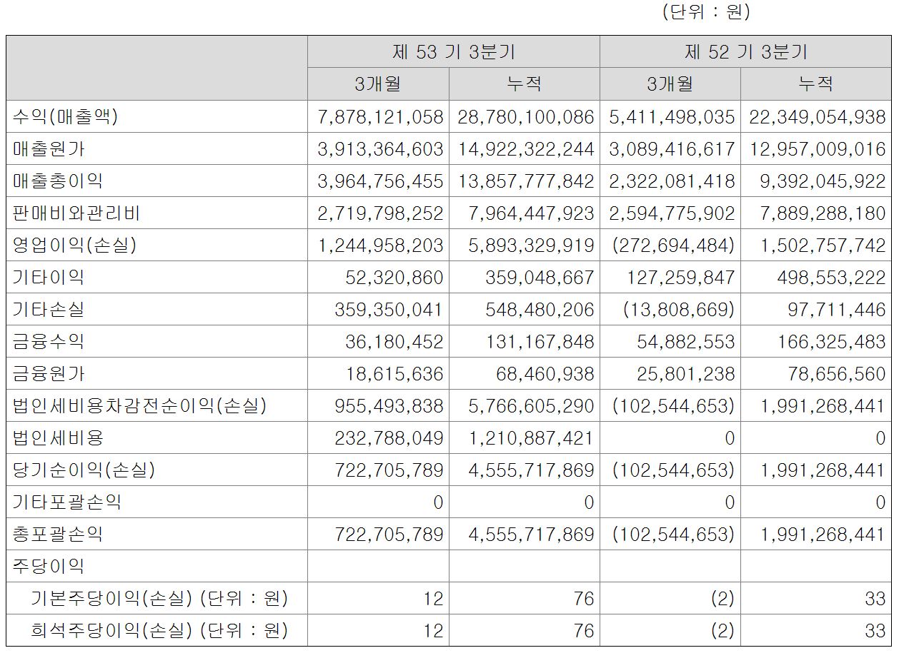 영업이익은 12억 원으로 전년 동기 대비 흑자전환했으며, 당기순이익은 7억 원을 기록하며 전년 동기 대비 흑자 전환했습니다.