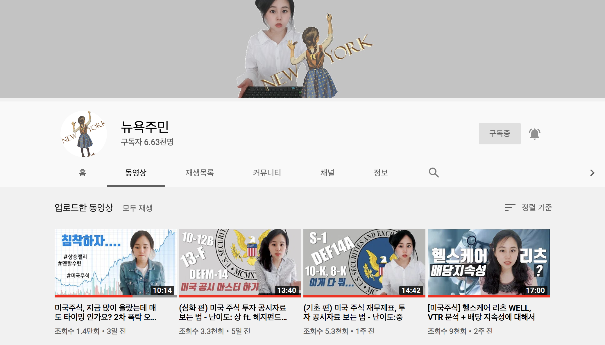 다섯번째 뉴욕주민입니다. 미국 주식을 디테일하게 분석하고 미국 회사들의 제무재표, 공시자료 분석하는 법까지 어디서 배울 수 없는 지식과 정보들을 제공하는 유튜버입니다. 미국 주식 현장에서 일하고 있는 분이라 더욱 신뢰가가고 영상 하나만 봐도 전문가 포스가 풀풀납니다. 분석뿐만 아니라 투자마인드에 관한 영상도 올라오는데 제 멘탈을 다잡는데 항상 도움이 됩니다. 가치투자라고 시작했던 것들이 상승이 일어난다고 매도하고 싶은 마음이 들때 뉴욕주민님의 영상을 보면 마음을 다잡을 수 있습니다. 구독자 수가 엄청난 속도로 늘고있는데 정말 앞으로가 기대 되는 유튜브 채널입니다. 꼭꼭꼭꼭꼭 들어가서 정주행 하시길 강력히 추천드립니다.