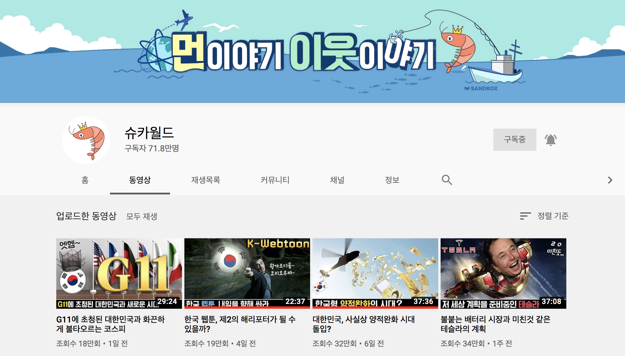 첫번째 슈카월드 입니다. 전반적인 국내외 경제, 주식과 관련된 이슈들을 다룹니다. 벌써 구독자가 71.7만명이네요. 매주 일요일마다 유튜브로 라이브 방송을 하고 이후 순차적으로 편집본이 유튜브 채널에 올라옵니다. 따라서 그때 그때 실시간으로 정보를 제공한다기 보다 한 주의 이슈들을 정리한다는 느낌으로 보시면 좋을 것 같습니다. 러닝타임 좀 길지만 말씀을 재밌게하셔서 시간가는 줄 모르고 보게 됩니다. 최근 공중파까지 진출하셔서 인지도가 상당히 높아졌습니다. 아마 모르는 분이 거의 없으실거라 생각됩니다.