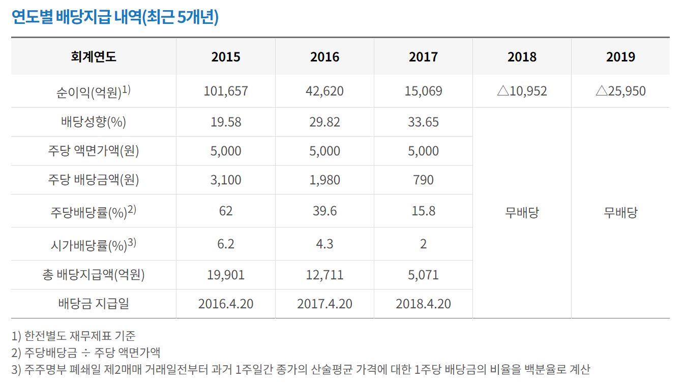 3분기 호실적을 발표하면서 올해는 배당금을 다시 주지 않을까라는 말이 돌고 있습니다. 대표적인 고배당주였던 한국전력의 배당을 살펴보면 2015년, 2016년 배당률이 각각 6.2%, 4.3%를 기록했습니다.