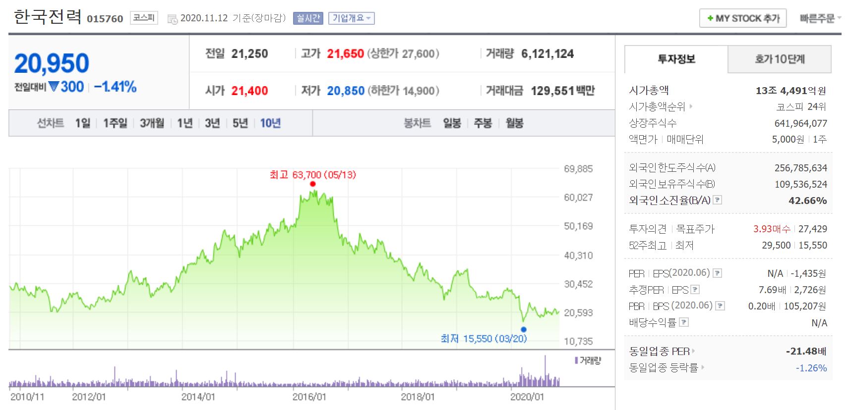 한국전력 주가는 최고의 실적을 보여주었던 2015~2016년을 끝으로 우하양하였습니다. 실적 악화, 탈원전 등이 주가 부진의 원인이었습니다.
