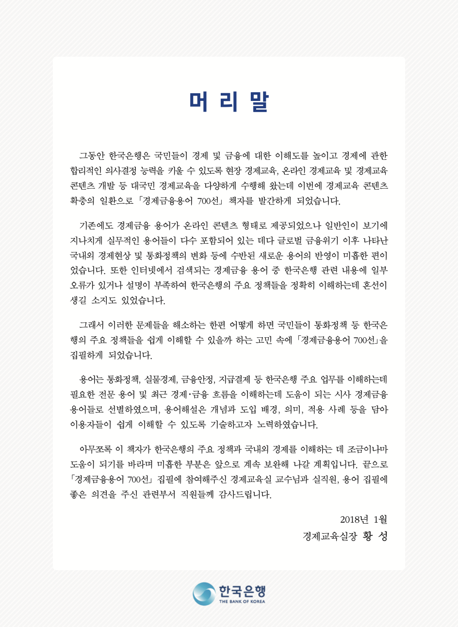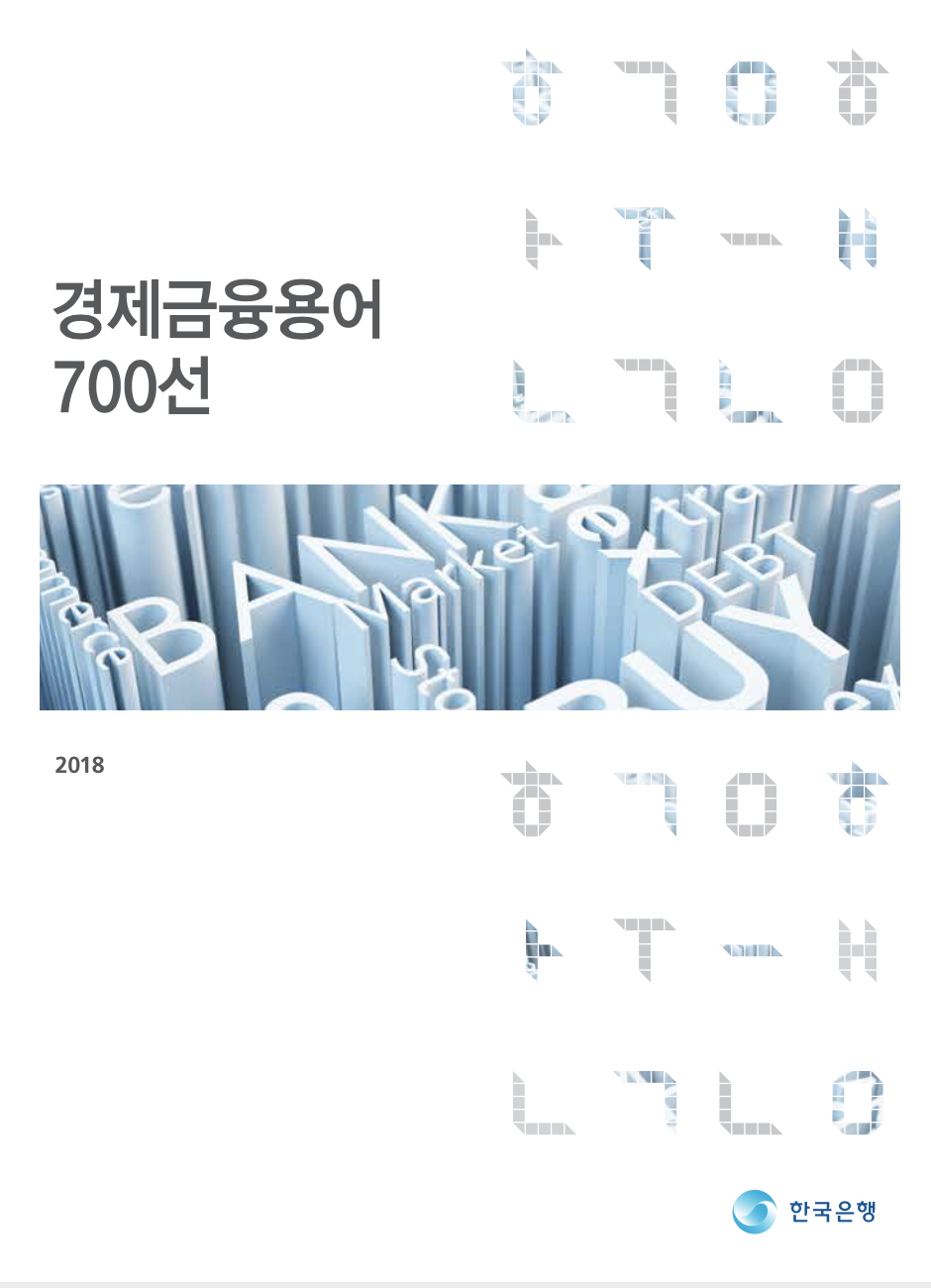 한국은행이 2018년 '경제금융용어 700선'이라는 단행본을 발행했습니다. 국민에게 올바른 경제 개념을 알리고 금융 이해도를 높이려는 의도였으며 경제에 관한 합리적인 의사결정을 돕기 위해 만들어졌습니다.
