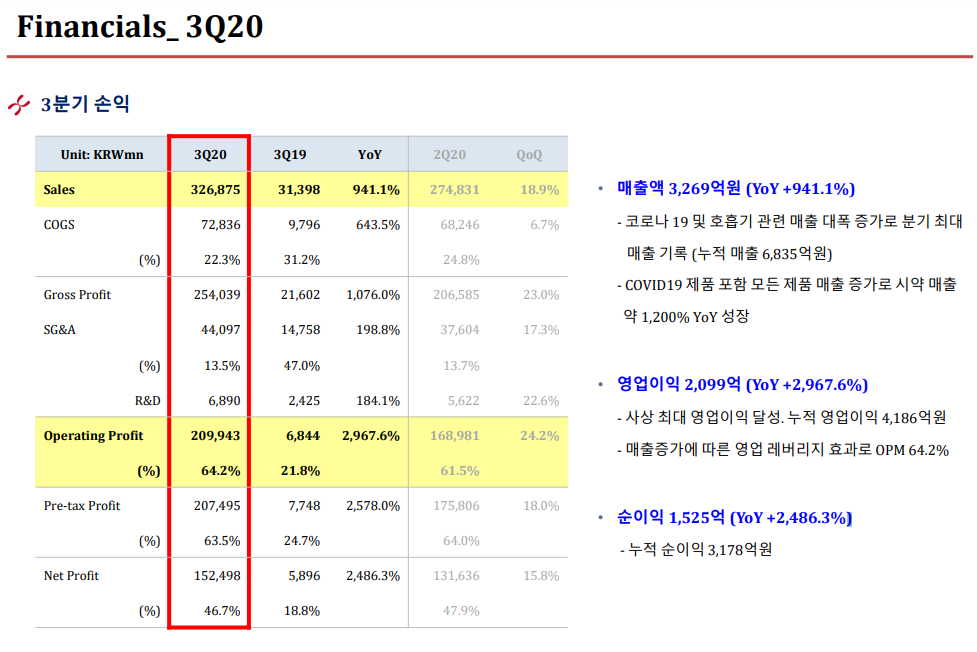유럽의 코로나 19 제품 수요가 폭증하면서 2분기에 비해서도 성장한 매출을 올렸으며 3분기 대규모 채용과 생산연구 투자에도 불구하고 64.2%라는 말도 안 되는 영업이익률을 보였습니다.