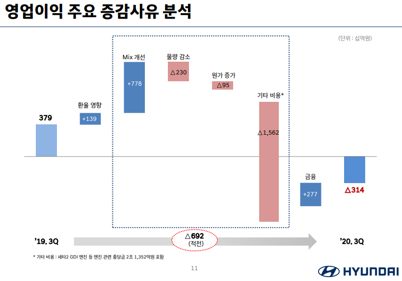 현대자동차는 3분기 매출은 성장하였으나 영업이익은 적자 전환했습니다. 하지만 이는 엔진 관련 충당금이 큰 규모로 반영된 수치입니다.