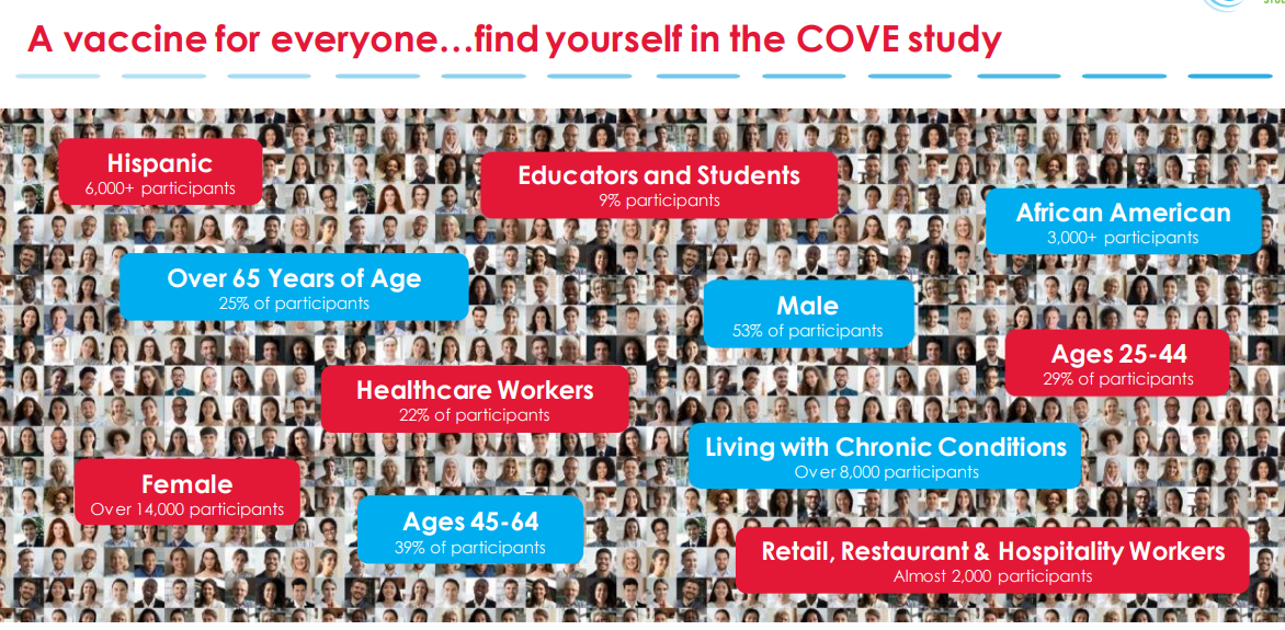 3만 여명이 모더나 코로나 백신 임상 3상에 참여했습니다. 4주 간격으로 두번씩 백신을 맞았고 반은 개발 중인 백신, 반은 플라시보(가짜 약)를 투여받았습니다.