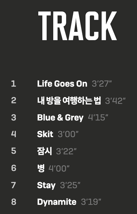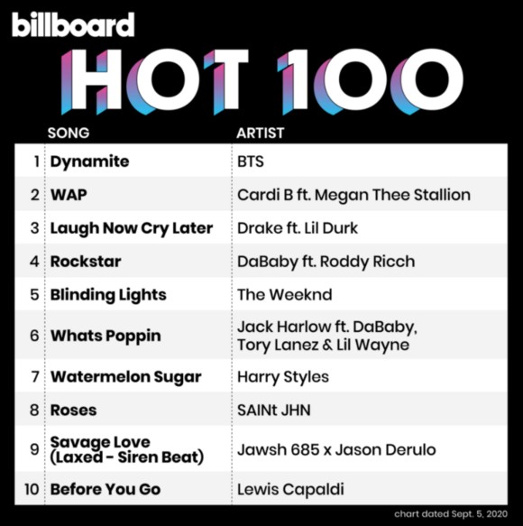 BTS(방탄소년단)는 'Dynamite'라는 곡으로 빌보드 핫 100에서 k-pop 최초로 1등을 기록하기도 했으며, 세계 1위 음원 스트리밍 플랫폼인 스포티파이 클로벌 탑 50 차트에서도 1위를 기록하였습니다. 또한 빌보드 200에서는 연속 4개의 앨범이 1위를 차지하는 대기록을 달성했습니다.