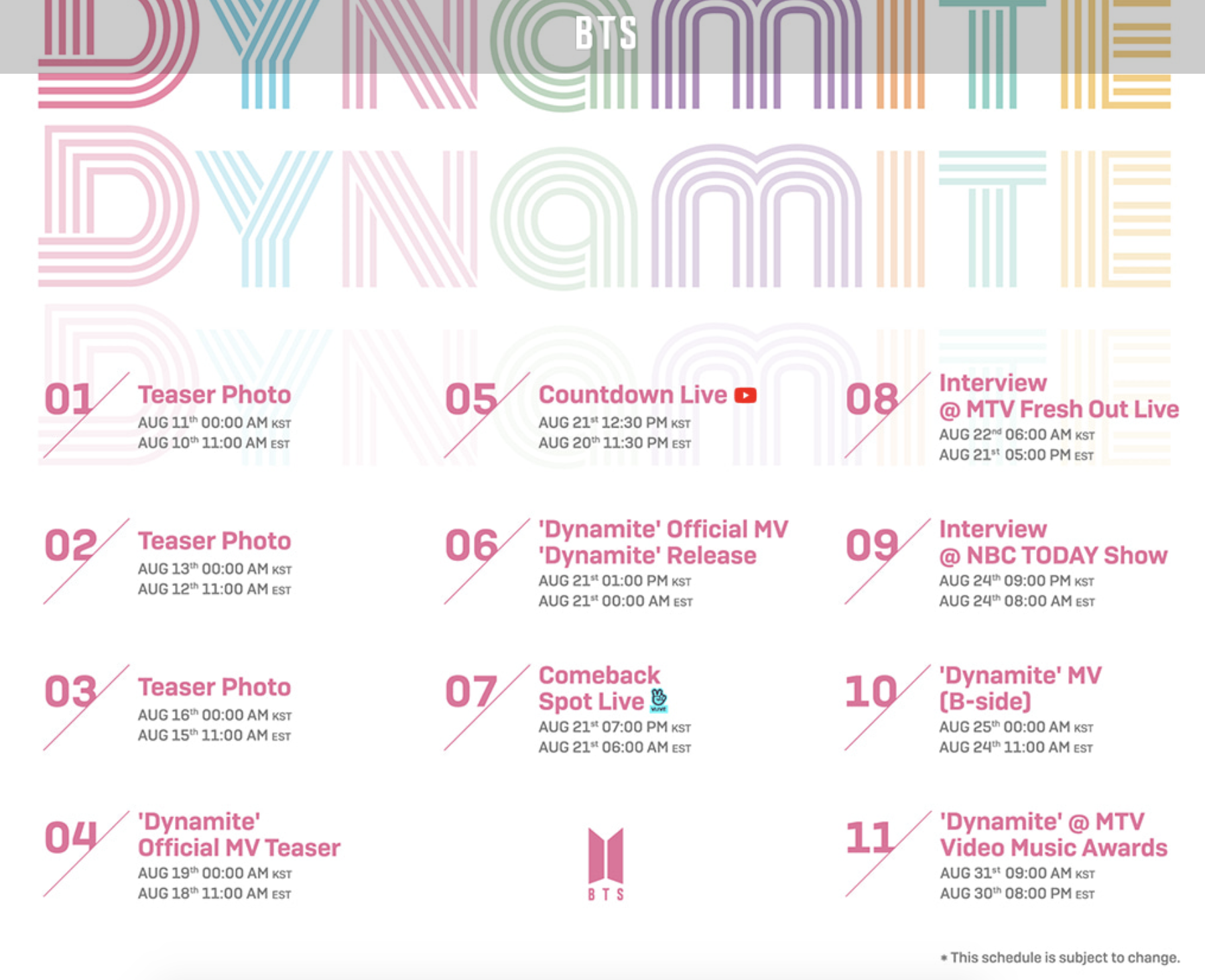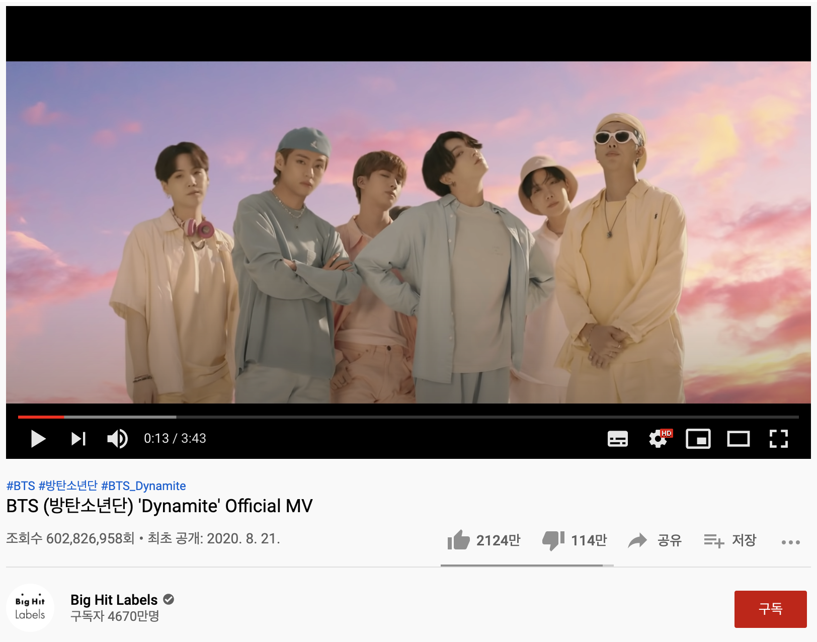 'Dynamite' 뮤직비디오는 유튜브 최단기간 1억 뷰 돌파 기록을 세우기도 하였으며 약 3달이 덜 지난 지금 6억 뷰를 돌파하며 인기를 과시하고 있습니다.