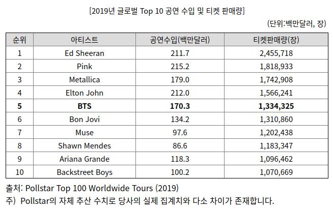 코로나 이전 2019년 BTS(방탄소년단)의 글로벌 월드 투어 총 매출은 1억 7,000만 달러(약 2,000억 원)를 기록했으며 이는 전 세계 투어 매출 6위에 달하는 기록입니다.