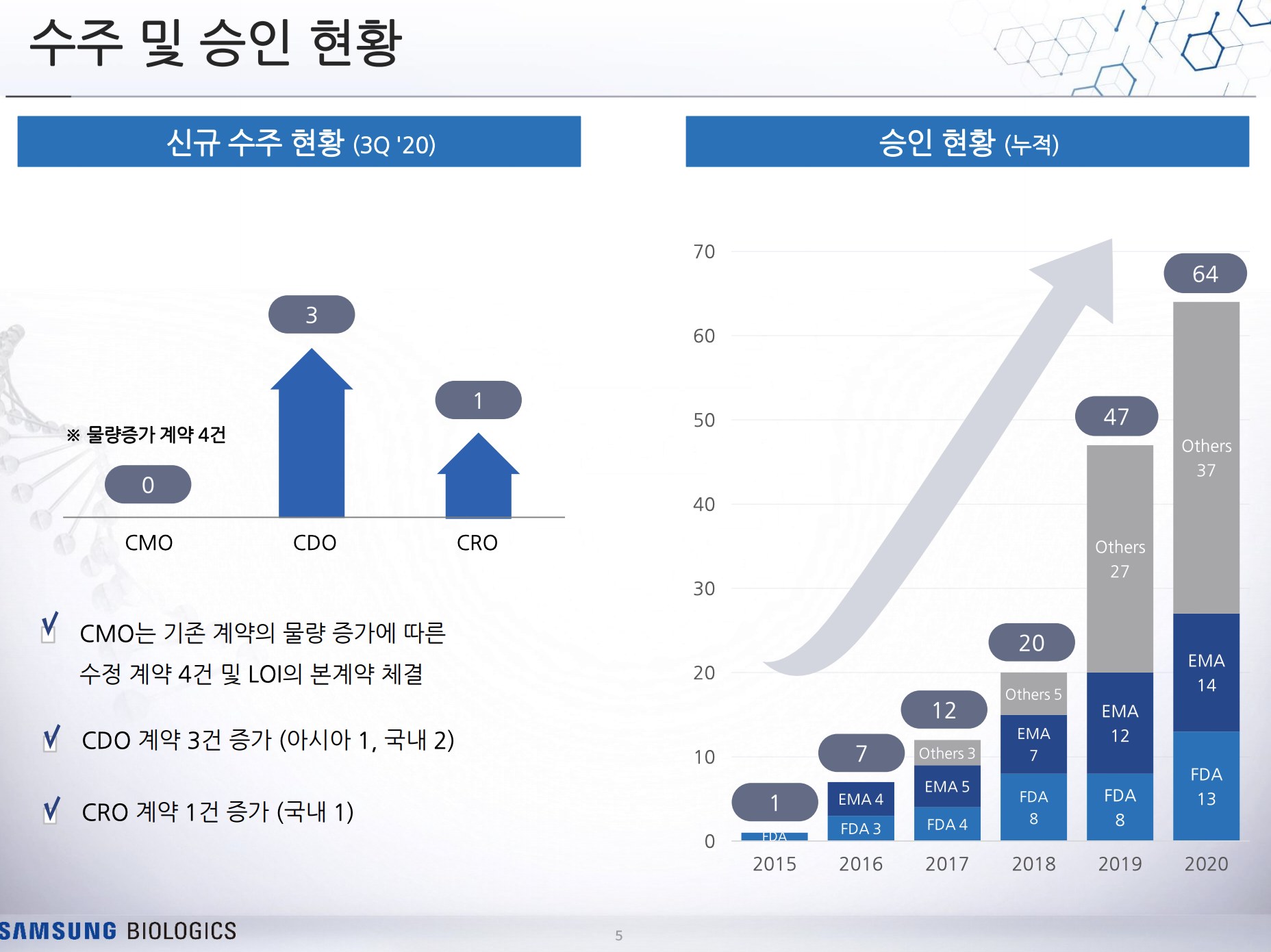 3분기 신규 수주의 경우 CDO(위탁연구개발) 3건, CRO(임상시험수탁) 1건이 있었으며 CMO(위탁생산)의 경우 기존 계약 4건의 물량 증가가 있었습니다.