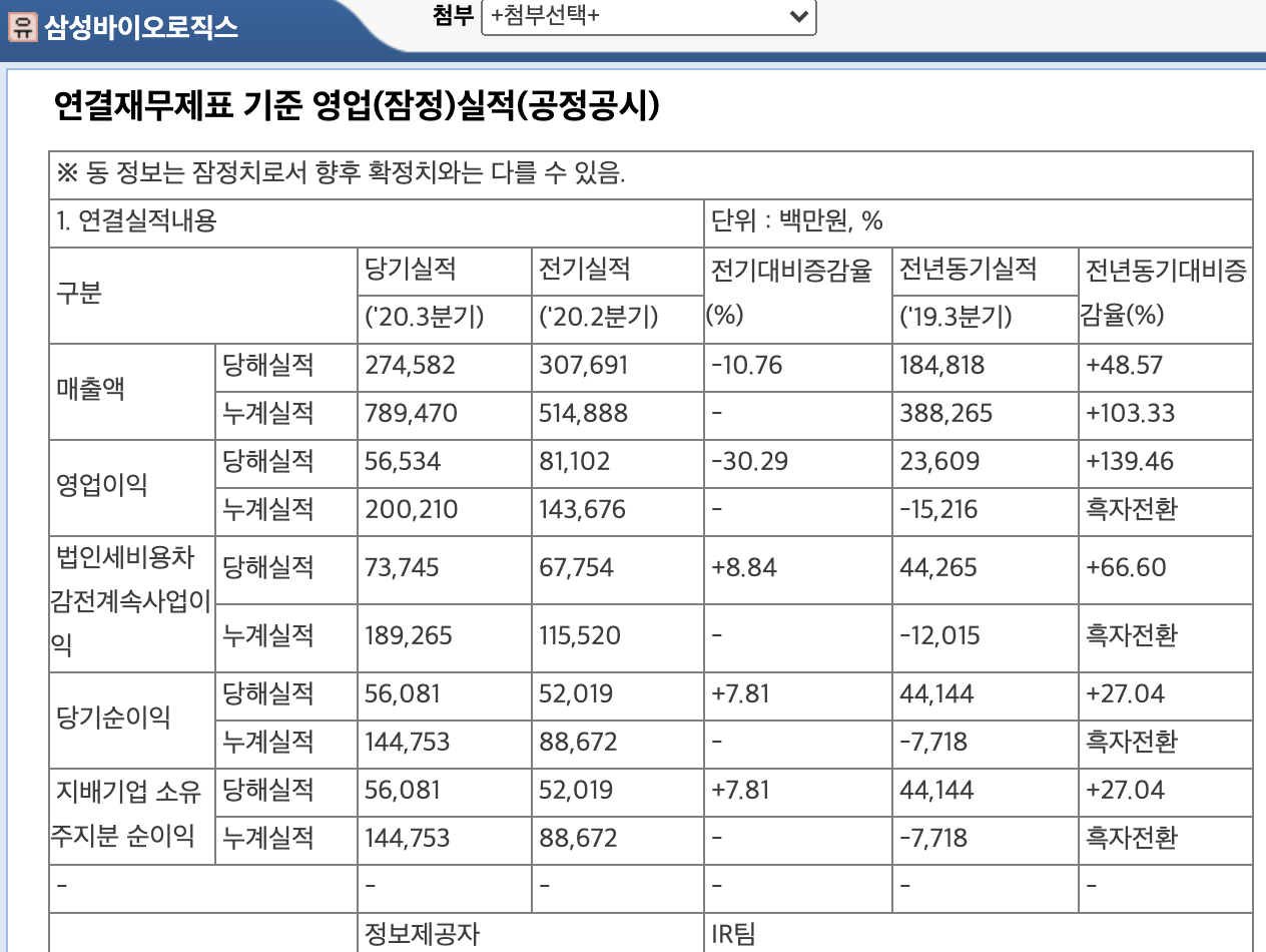 삼성바이오로직스가 3분기 잠정 실적을 공시했습니다. 전분기보다는 아쉽지만 전년 동기 대비 큰 폭의 성장을 보였습니다.