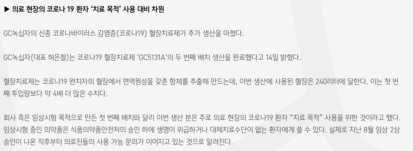 GC녹십자랩셀은 검체검진, 바이오 물류 사업의 큰 성장으로 역대급 실적을 기록했으며 GC녹십자엠에스의 경우 코로나 19 진단키트 수출 덕에 호조세를 보였습니다. GC녹십자웰빙 역시 안정적인 성장을 이어나갔습니다.