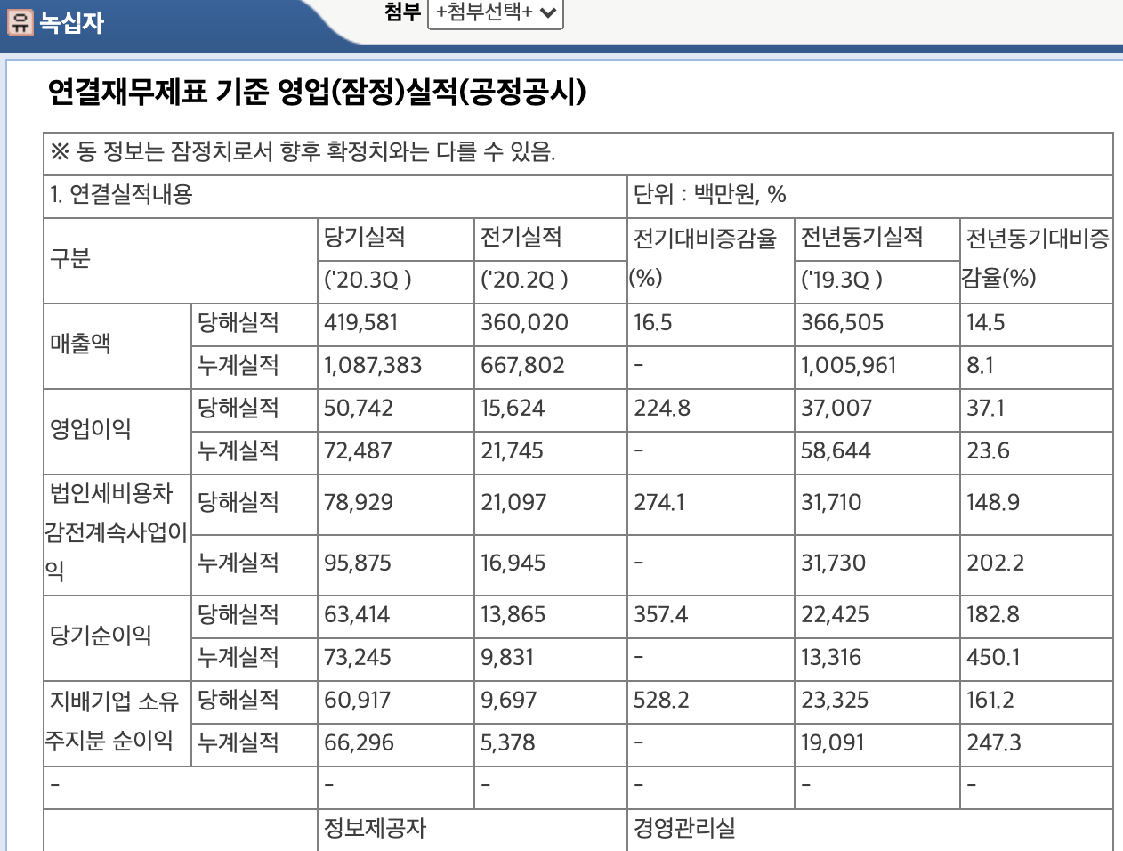 녹십자가 3분기 잠정 실적을 공시했습니다. 코로나 19로 인해 엔터테인먼트 사업 전체가 큰 타격을 받았음에도 불구하고 호실적을 내놓았습니다.