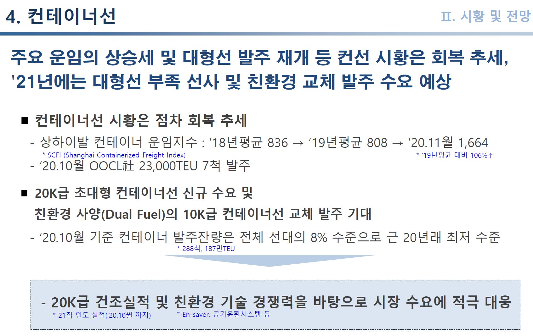 또한 현재 15년 이상된 노후선 비중이 전체의 25% 이상을 차지하고 있어 IMO 환경규제로 인한 노후선 교체 발주 수요(교체 주기 도래) 증가도 예상되고 있습니다. 지수 폭등 등으로 인한 초대형, 대형 컨테이너선 신규 수요와 교체 발주 역시 기대되고 있습니다.