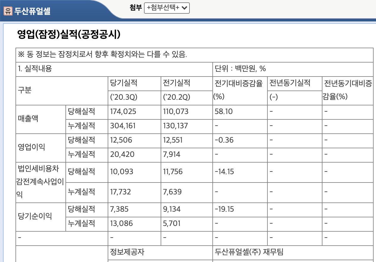 두산퓨얼셀이 3분기 실적을 공시했습니다. 매출이 매분기 고성장을 거듭하고 있습니다.