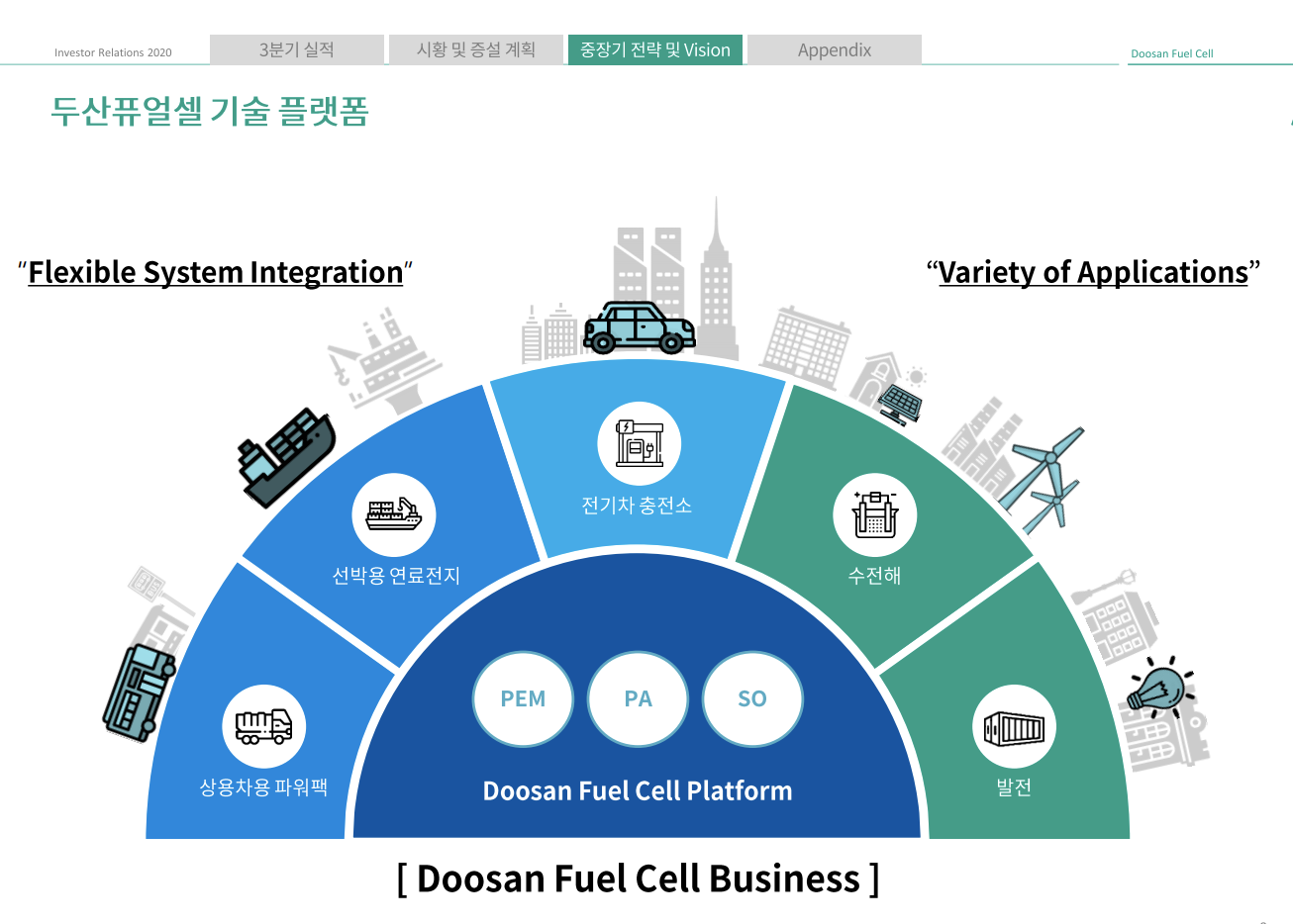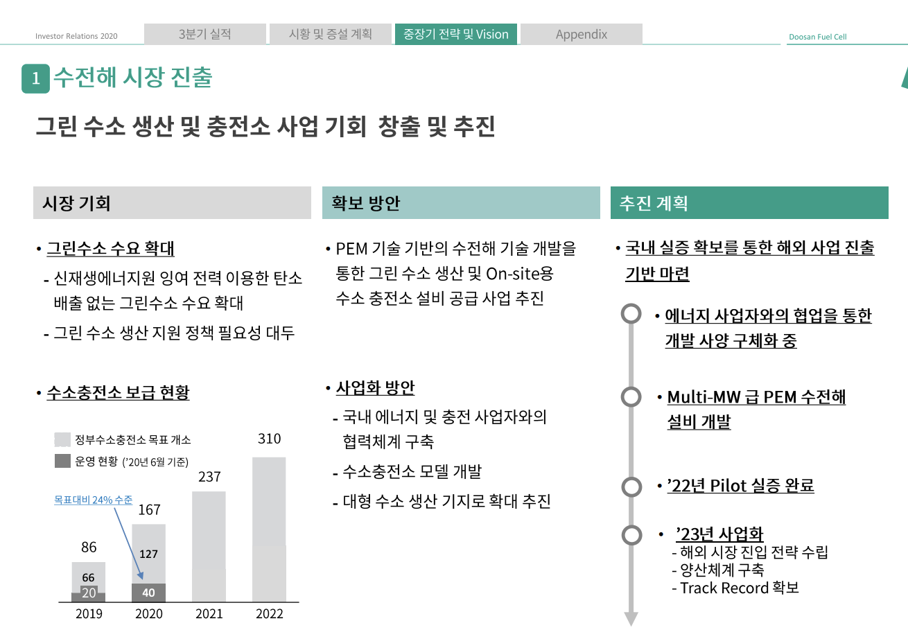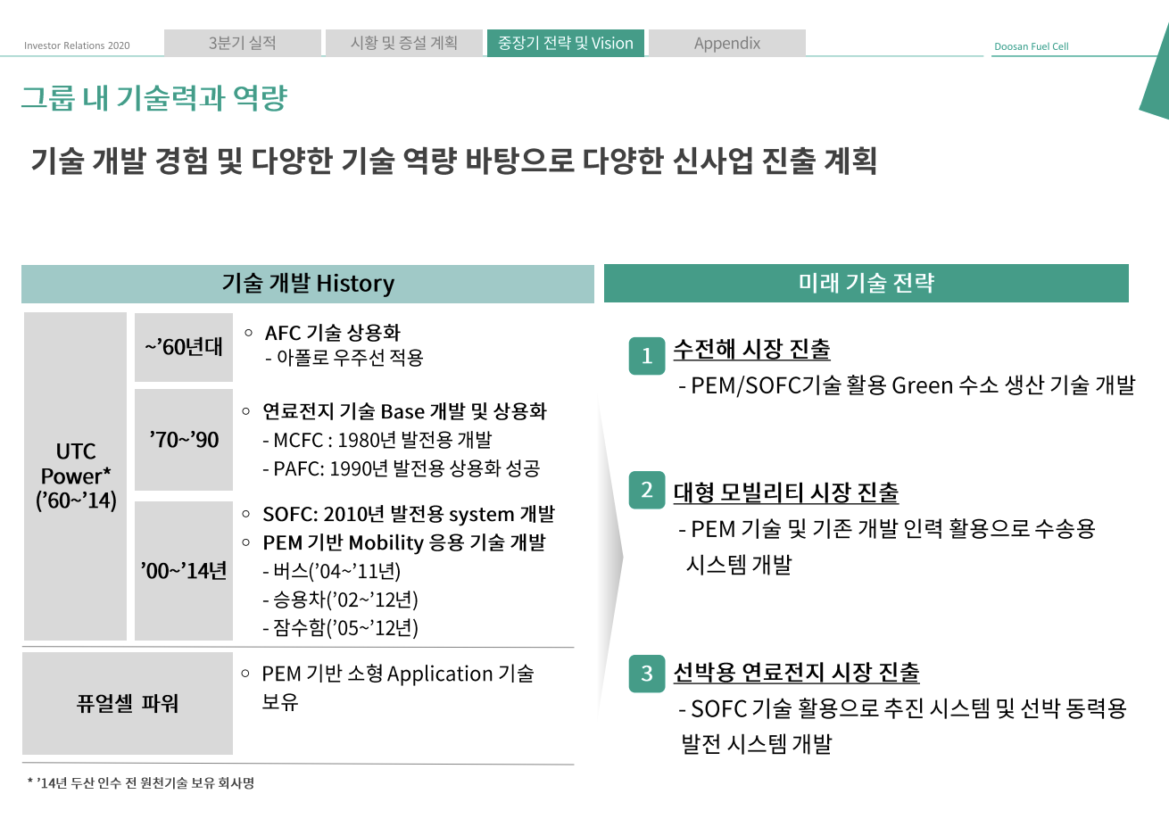 두산은 그룹 차원에서 수소경제에 적극적으로 투자하고 있습니다. 수전해, 수소충전소, 발전용 연료전지, 수소 모빌리티(버스, 드론 등), 선박용 수소 연료전지, 건물, 가정용 에너지까지 체질개선에 힘을 쏟고 있는 상황입니다.