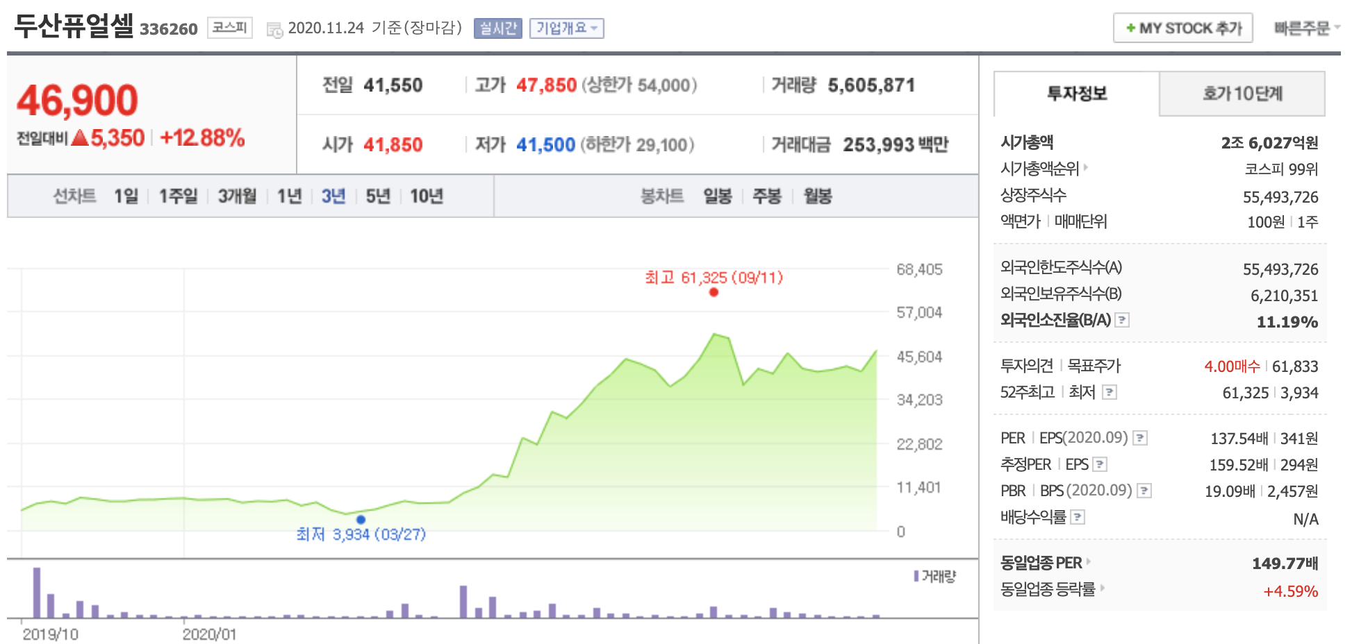 두산퓨얼셀 주가는 코로나 19 이후 그린뉴딜, 수소관련주 등으로 묶이며 강력한 주가 상승을 보였습니다. 시가총액이 2조 6,000억 원에 달하며 코스피 99위를 기록하고 있습니다.