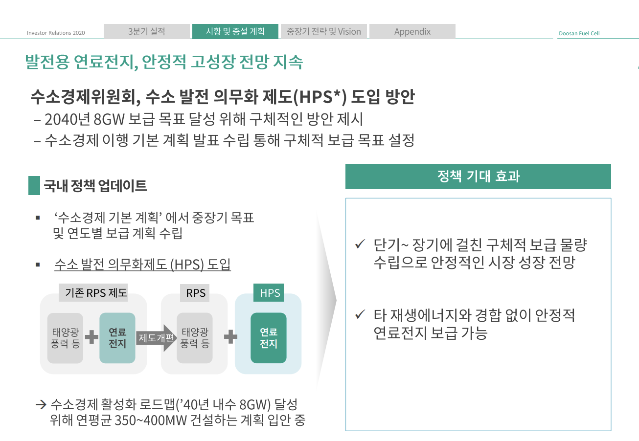 흥미로운 점은 계절적 비수기임에도 불구하고 호실적을 기록했다는 것입니다. 보통 두산퓨얼셀은 발전사로부터 입찰제안서를 상반기에 공고하고 1차 납품 매출이 4분기에 나머지 수주 물량은 다음해 2분기에 납품이 집중 되는 경향이 있습니다.
