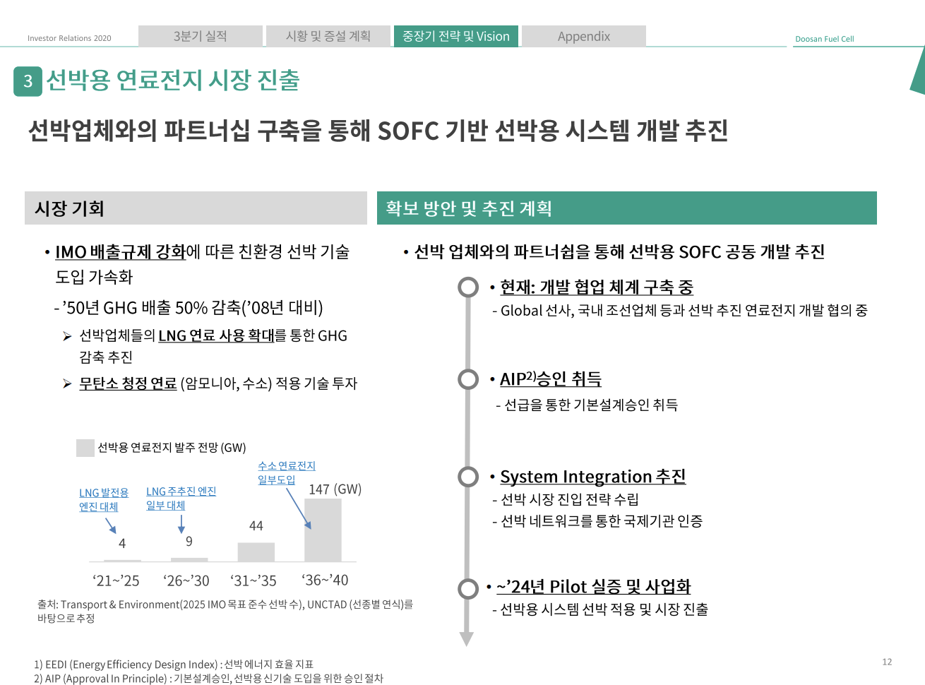 마지막 하이라이트는 선박용 고체산화물 연료전지(SOFC) 진출입니다. IMO(국제해사기구)의 규제로 인해 선박 역시 친환경으로 바꾸어야 하는 상황에 놓여있습니다.