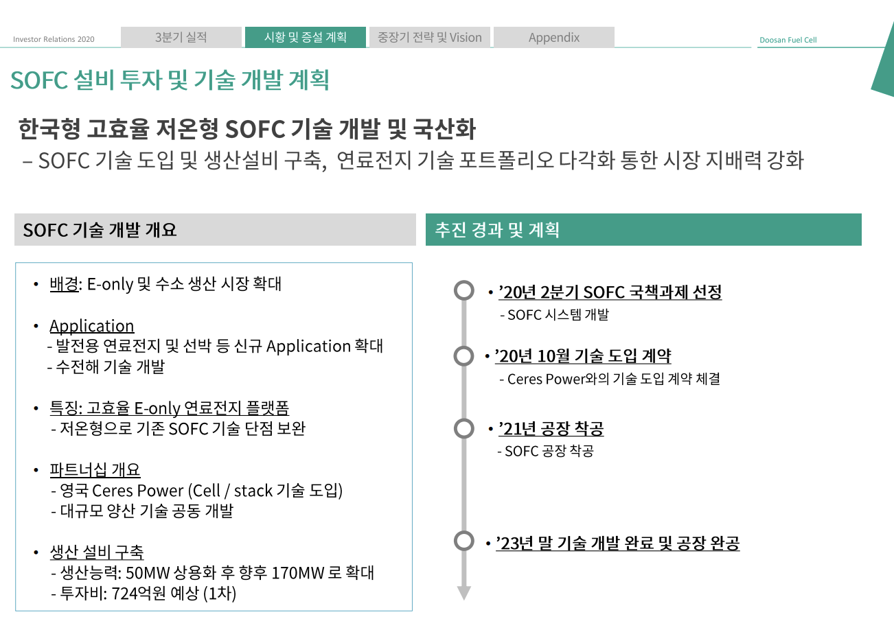 글로벌 선사와 국내 조선업체들과 협업을 통해서 개발을 진행하며 2024년 사업화할 계획입니다. 10월 19일 724억 원 규모의 고체산화물 연료전지(SOFC) 설비 투자를 알리기도 했습니다.