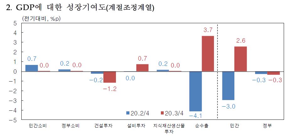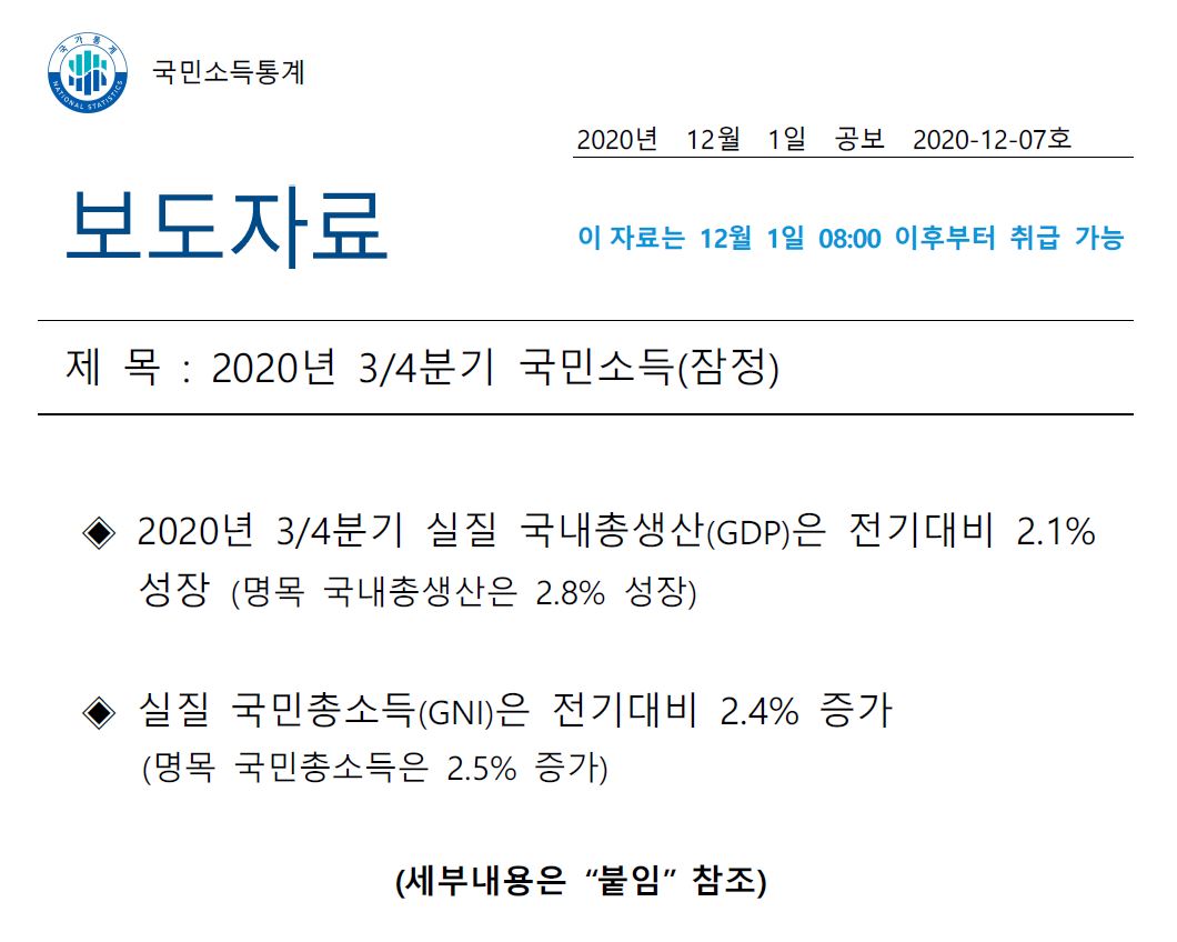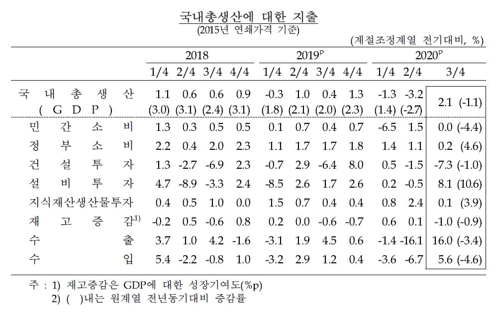 2020년 3분기 GDP(국내총생산)은 전기대비 2.1%를 기록했습니다. 명목 국내총생산은 2.8% 성장했습니다.