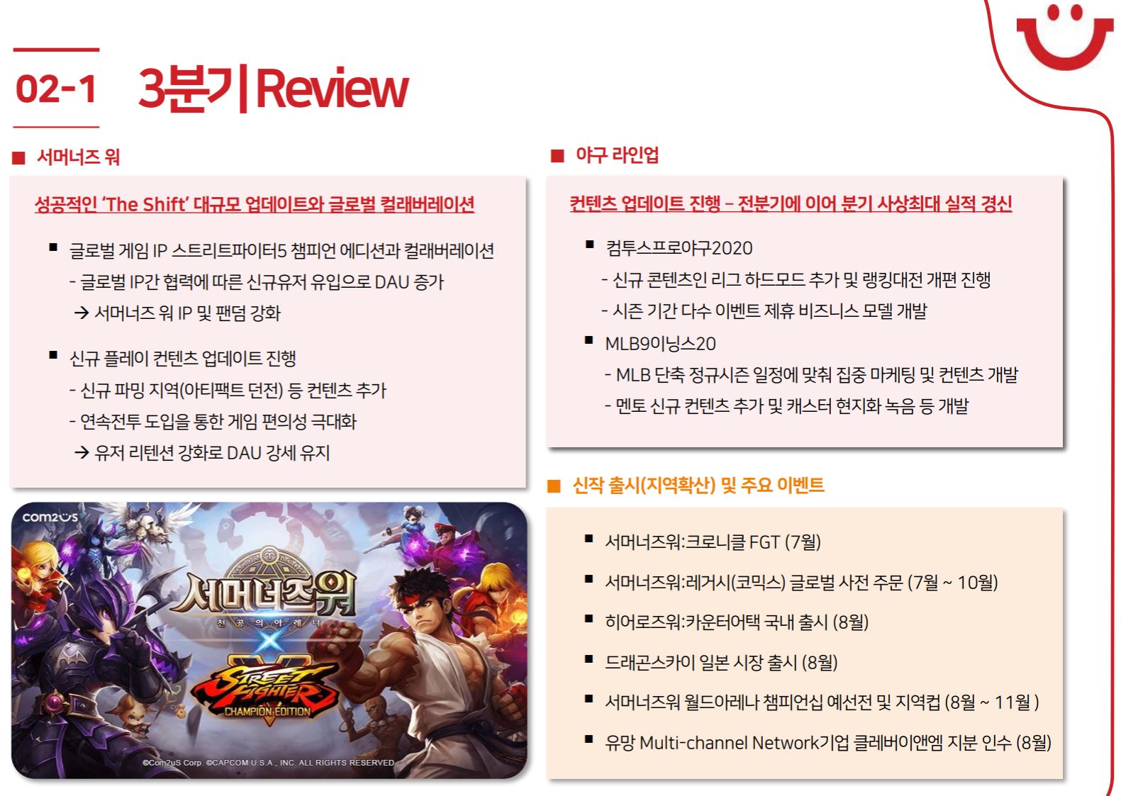 '아웃 오브 더 파크', '서머너즈 워:백년전쟁', '슈퍼 액션 히어로 리턴즈', '히어로즈워:카운터어택' 등 신작, 기존 개임 글로벌 출시 라인업이 탄탄하게 자리잡고 있습니다.