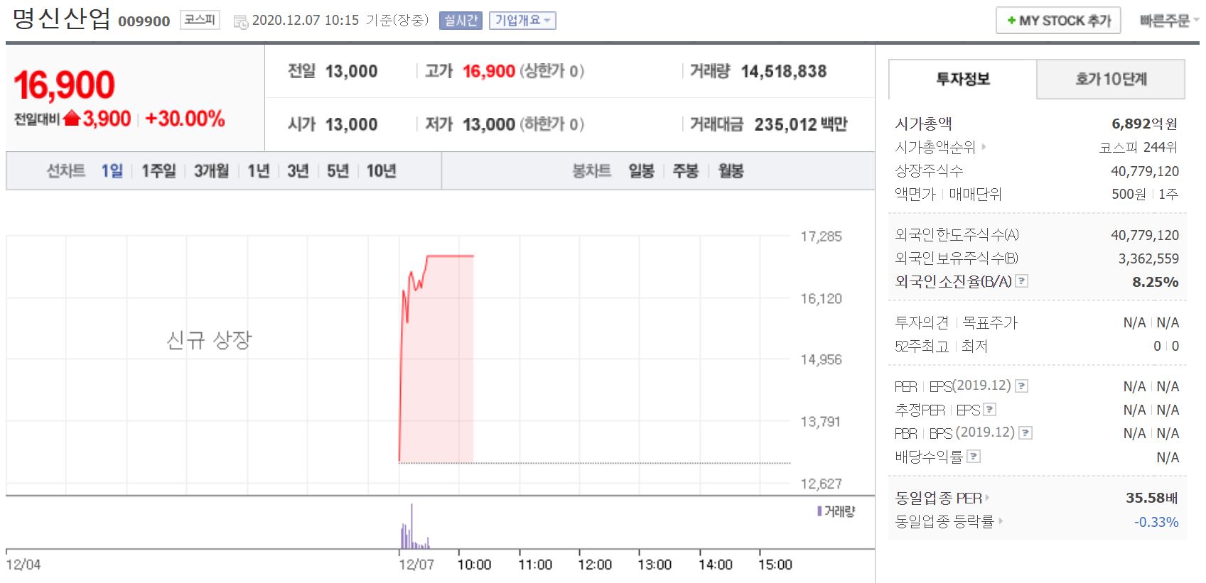 명신산업 주가는 상장 직후 상한가에 도달하며 따상에 성공했습니다. 테슬라에 부품을 공급한다고 알려져있어 인기몰이를 하고 있습니다.