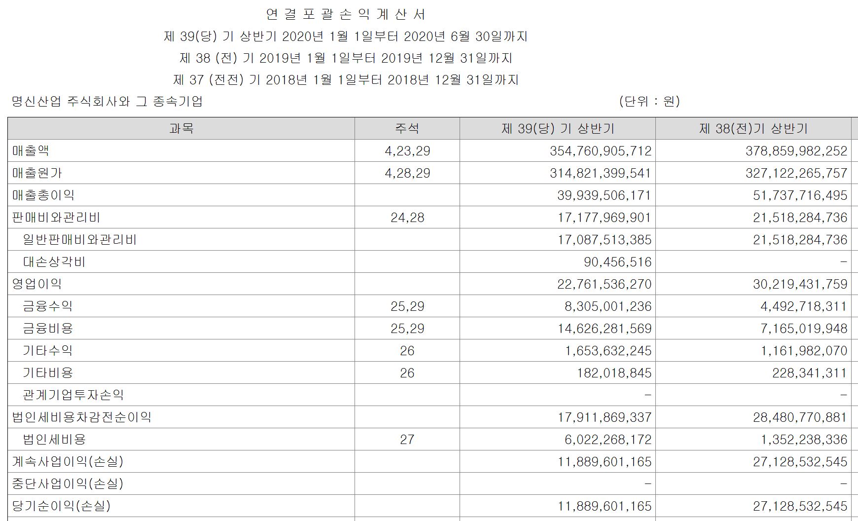 2019년 상반기 실적 매출 3,788억 원, 영업이익 302억 원, 271억 원과 비교하면 코로나 19에도 불구하고 비교적 안정적인 실적입니다.
