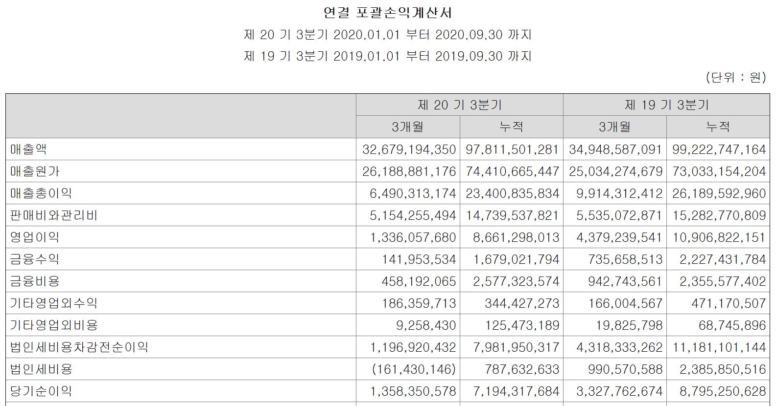 3분기 실적을 살펴보면 매출은 전년 동기 대비 6.6% 감소한 327억 원을 기록했으며, 영업이익은 13억 원을 기록하며 전년 동기 대비 84% 감소하였으며, 당기순이익은 14억 원을 기록하며 전년 동기 대비 81% 감소하였습니다.