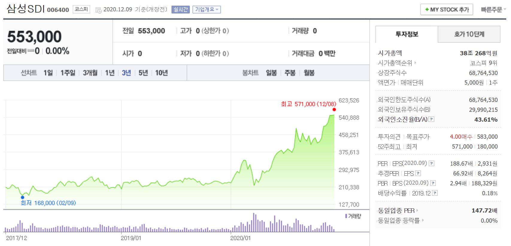 삼성SDI 주가는 코로나 19 이후 전기차 흐름에 따라 코로나 19 저점 대비 3배 가까운 상승을 보였습니다.