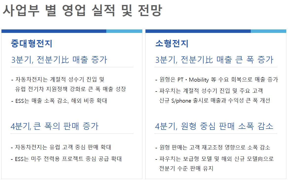 중대형 전지는 자동차의 계절적 성수기 진입 및 유럽 전기차 지원정책 강화로 큰 폭의 매출 성장을 이끌어 냈습니다.
