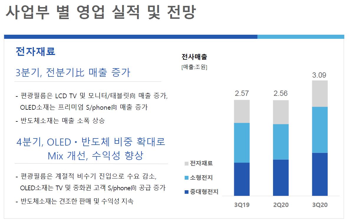 전자재료 역시 LCT TV, 토니터, 태블릿, OLED 모두 매출이 증가하며 좋은 흐름을 보이고 있습니다.