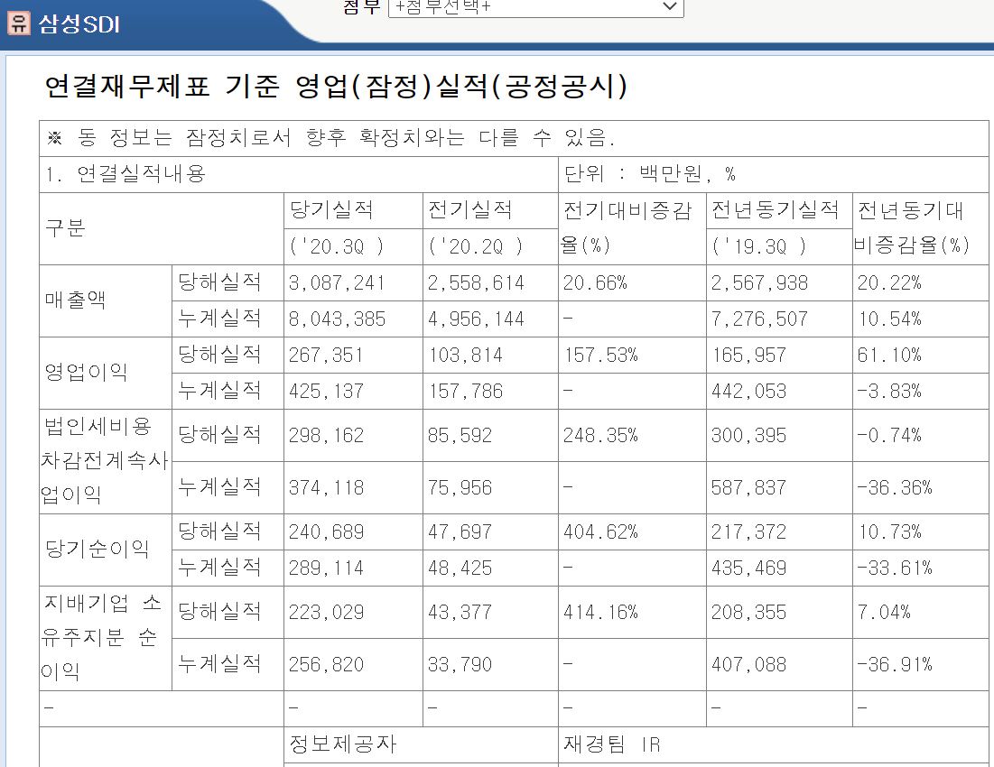 삼성SDI가 3분기 실적을 공시했습니다. 역대 최대 매출을 기록하며 좋은 좋은 성장흐름을 보이고 있습니다.