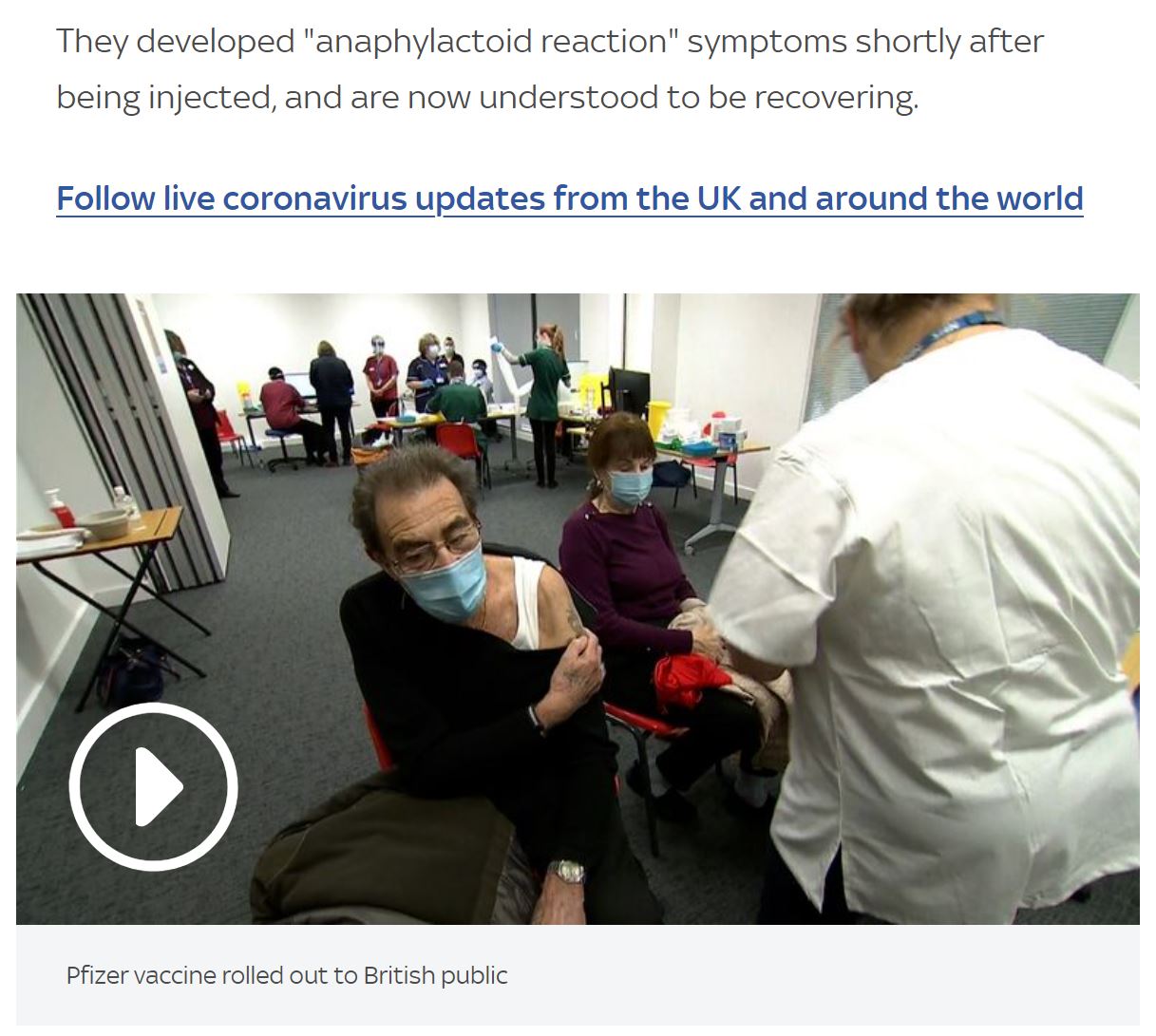 알레르기 반을을 보인 2명은 국민보건서비스(NHS) 직원으로 8일 백신을 접종받은 뒤 과민성 유사반응(Anaphylactoid reaction) 증상이 발생했고 현재 회복 중에 있습니다.