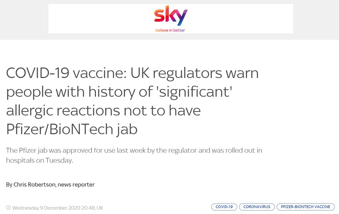 영국의 국민보건서비스(NHS)와 의약품건강관리제품규제청(MHRA)은 조사가 진행되는 동안 과거 약품, 음식, 백신 등과 관련해 알레르기 반응이 있었던 사람들은 화이자 백신 접종을 받지 말아야 한다고 발표했습니다.