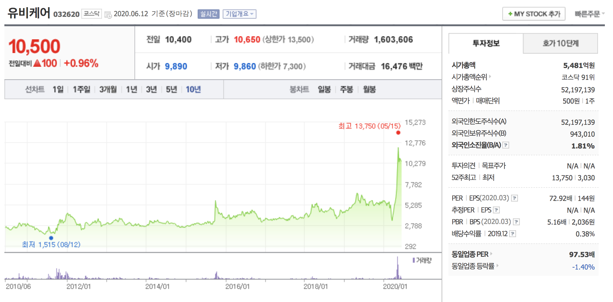 유비케어는 원격 의료, U-헬스케어 사업을 영위하는 기업입니다. 국내 요양기관 EMR 시장 점유율 1위 기업으로 의료정보 플랫폼 사업, 개인 건강정보 관리 플랫폼 사업, 의료기기 및 의약품 유통 사업 등을 영위하고 있습니다. 카카오와 협업 중인 진료예약 어플 똑닥의 이용자 수가 꾸준히 증가하고 있으며 코로나 이후 더욱 더 상승세가 가팔라질 것으로 보여 기대가 되는 회사입니다. 녹십자헬스케어가 지분 약 52%를 보유하며 대주주로 앉아있습니다.