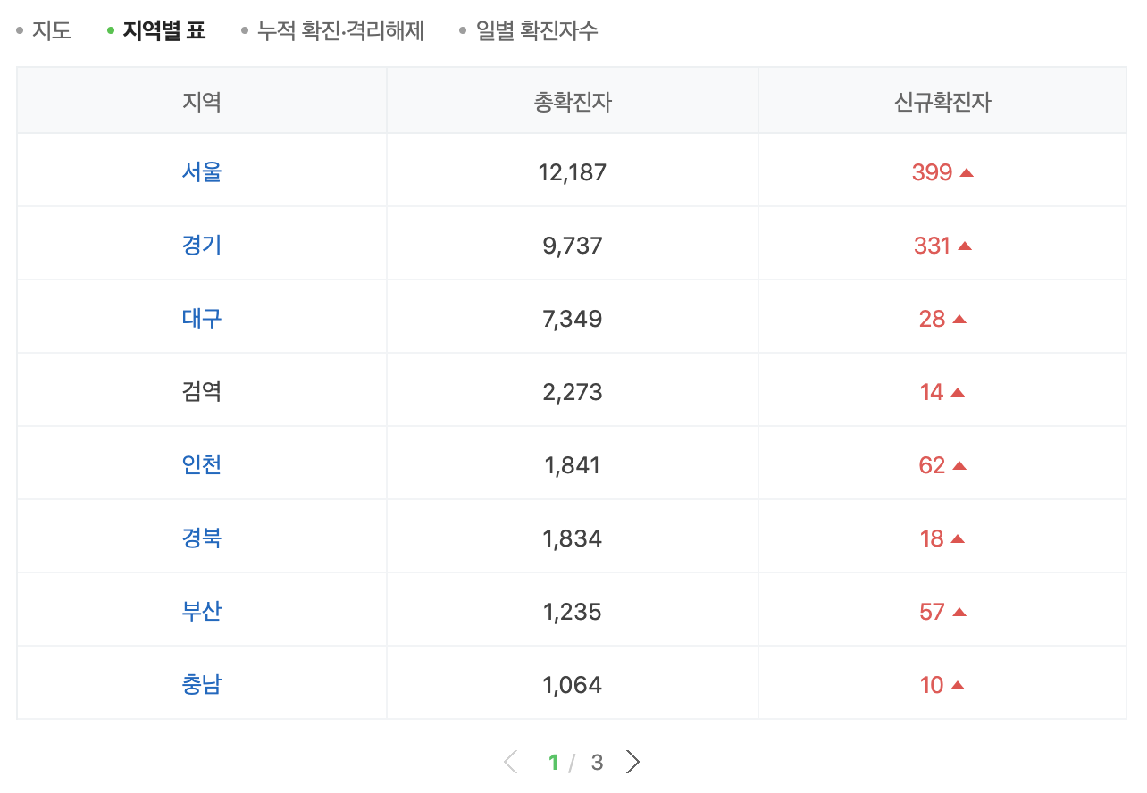 지역별 코로나 확진자를 살펴보면 서울 396명, 경기 328명, 인천 62명으로 수도권에서만 786명이 발생했으며, 수도권 외 지역에서는 부산 56명, 대구 28명, 광주14명, 대전 13명, 울산 8명, 강원 17명, 충북 15명, 충남 9명, 전북 8명, 전남 5명, 경북 18명, 경남 22명, 제주 3명입니다.
