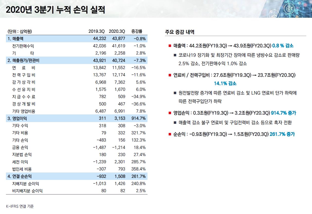 누적 연료비는 11조 5,516억 원으로 전년 동기 대비 16.5% 감소하였으며 전력 구입비도 11.6% 줄어든 12조 1,763억 원을 기록했습니다.