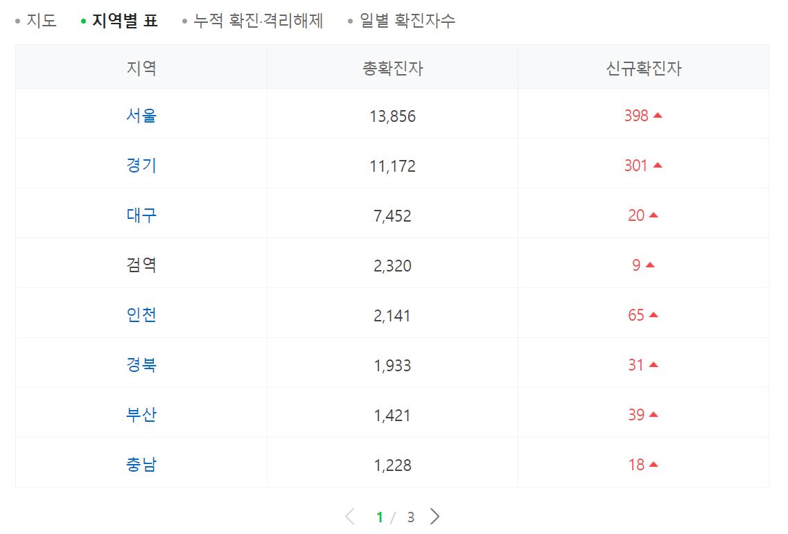 코로나 19 사망자는 11명을 기록했으며, 지역별 코로나 확진자를 살펴보면 서울 393명, 경기 300명, 인천 64명, 경남 43명, 부산 39명, 경북 31명, 울산·충북 각 30명, 제주 27명, 대구 20명, 강원 18명, 충남 16명, 전북 12명, 대전 5명, 전남 5명, 광주 3명입니다.